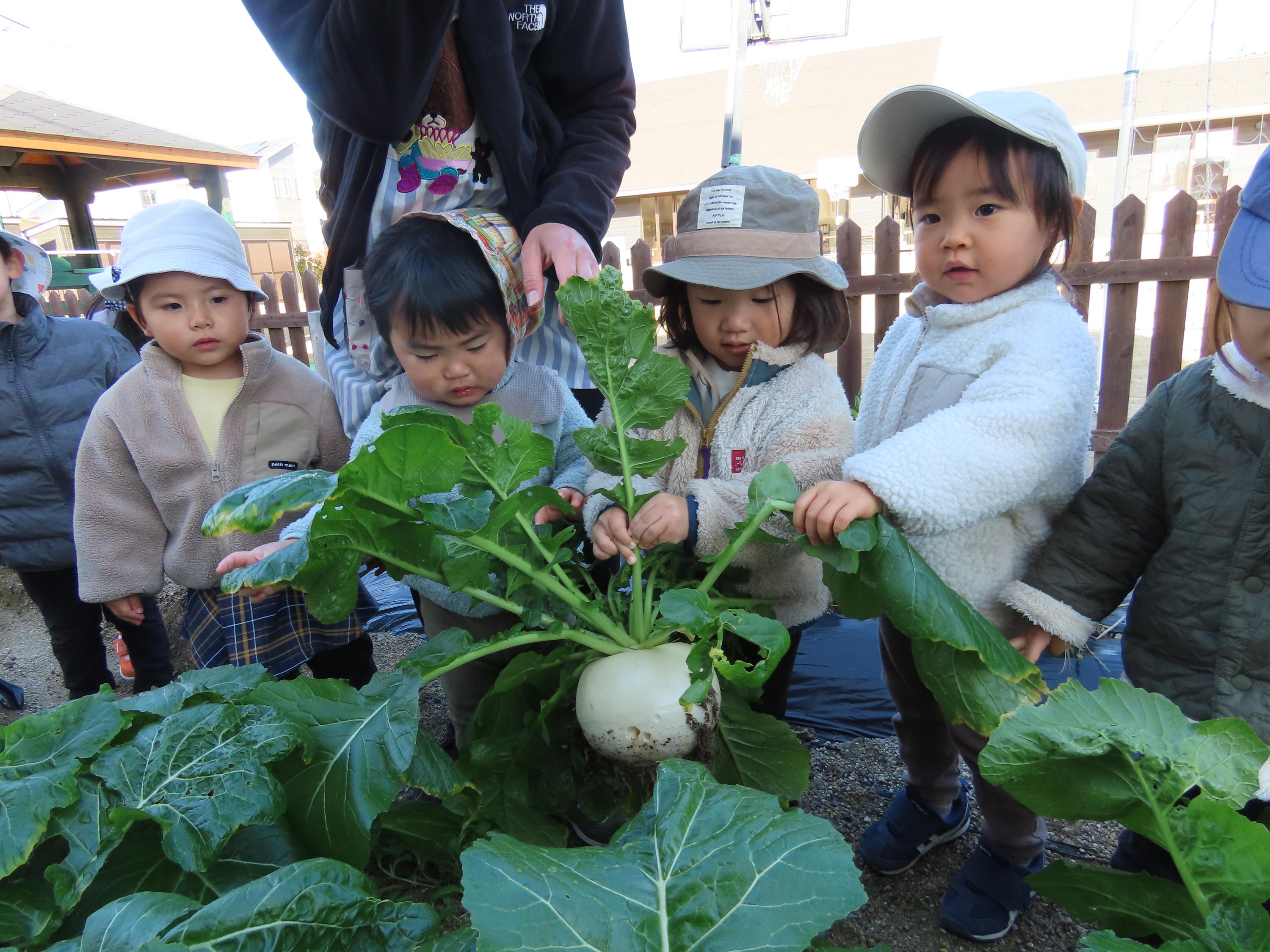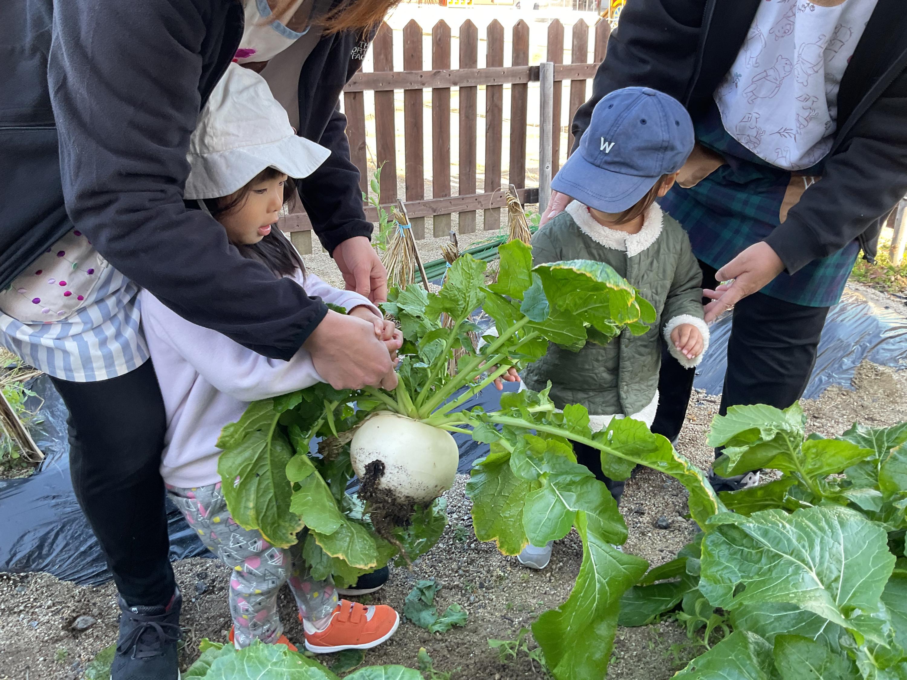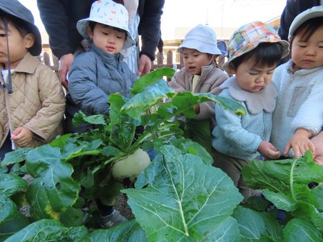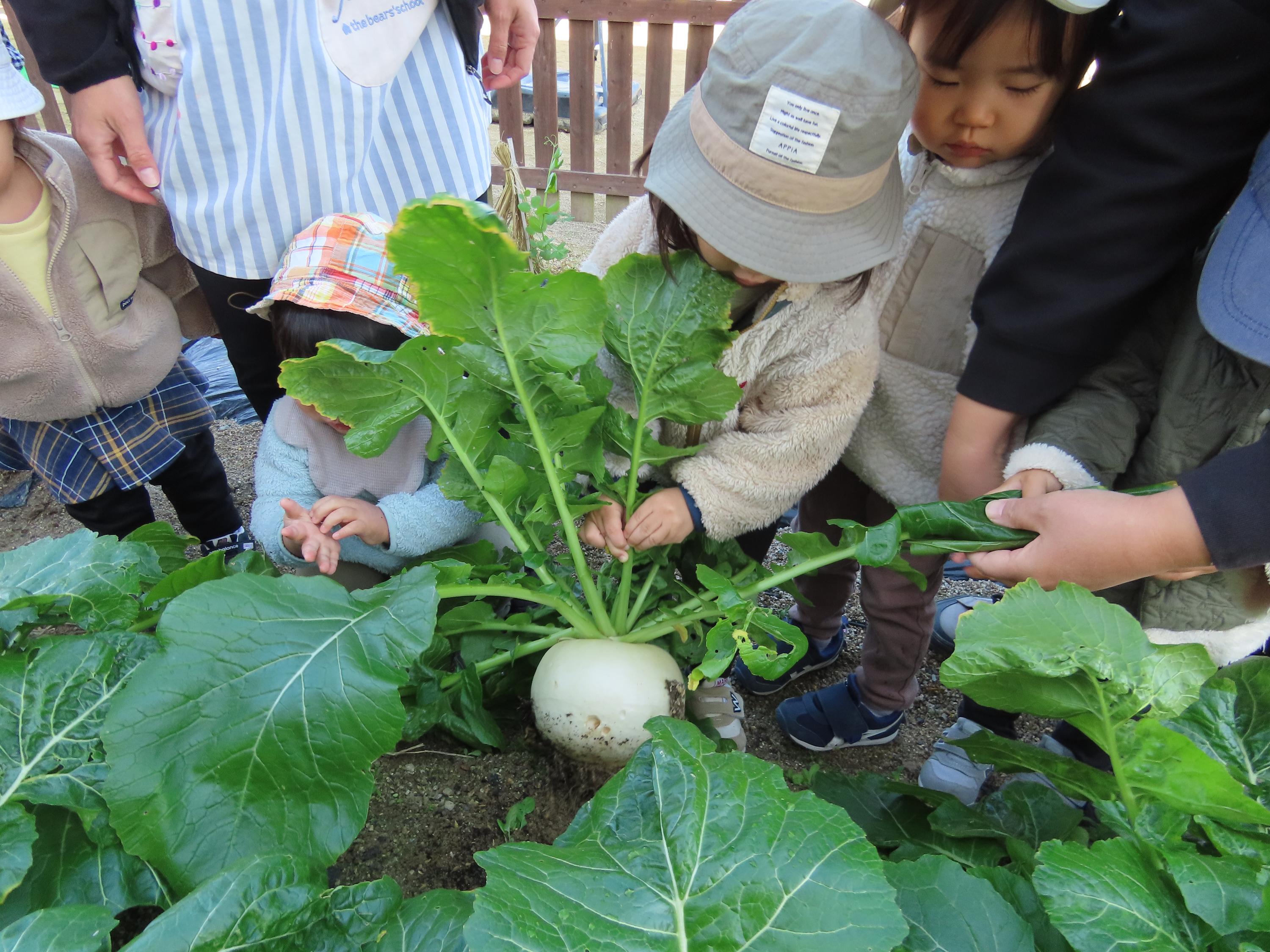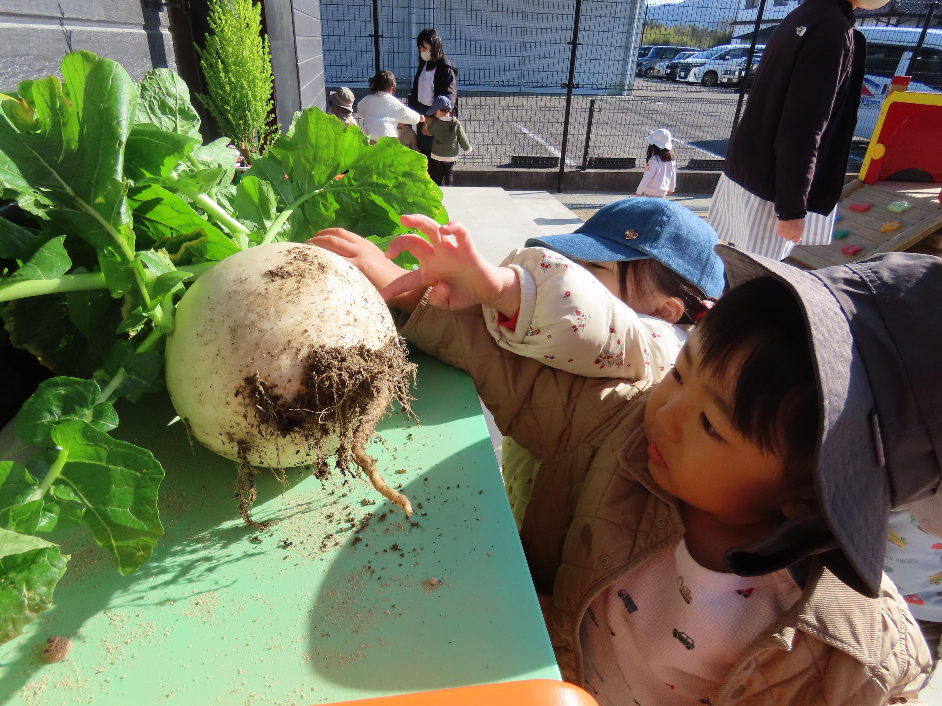 【大きなカブ~ぽっぽ組㈫㈮コース】 畑に大きなカブができました。 ぽっぽ組(火)(金)コースのお友だちが畑にカブを採りに行きましたよ。 大きな葉っぱがたくさん。その下に真っ白なカブが出来ています。「たくさん、あるねぇ。」 「うんとこしょ、どっこいしょ」おおきなカブがぬけましたよ。 「これが、『根っこ』ですよ。おひげみたいねぇ。」 根っこに『ミミズ』が、からまっていてびっくり! 「お迎えの時にお家の人にも見てもらおうね。」カブを靴箱の上に置きました。