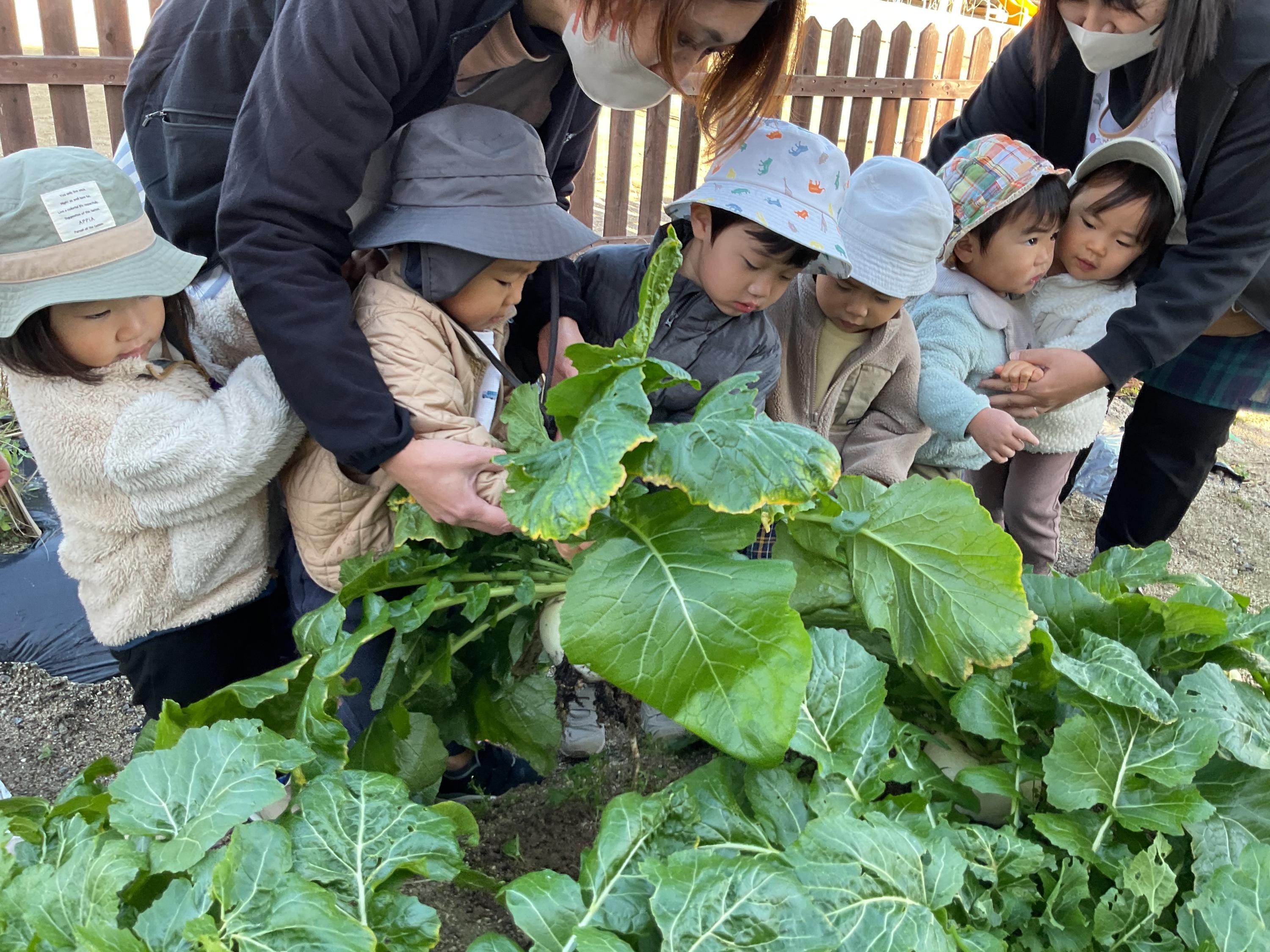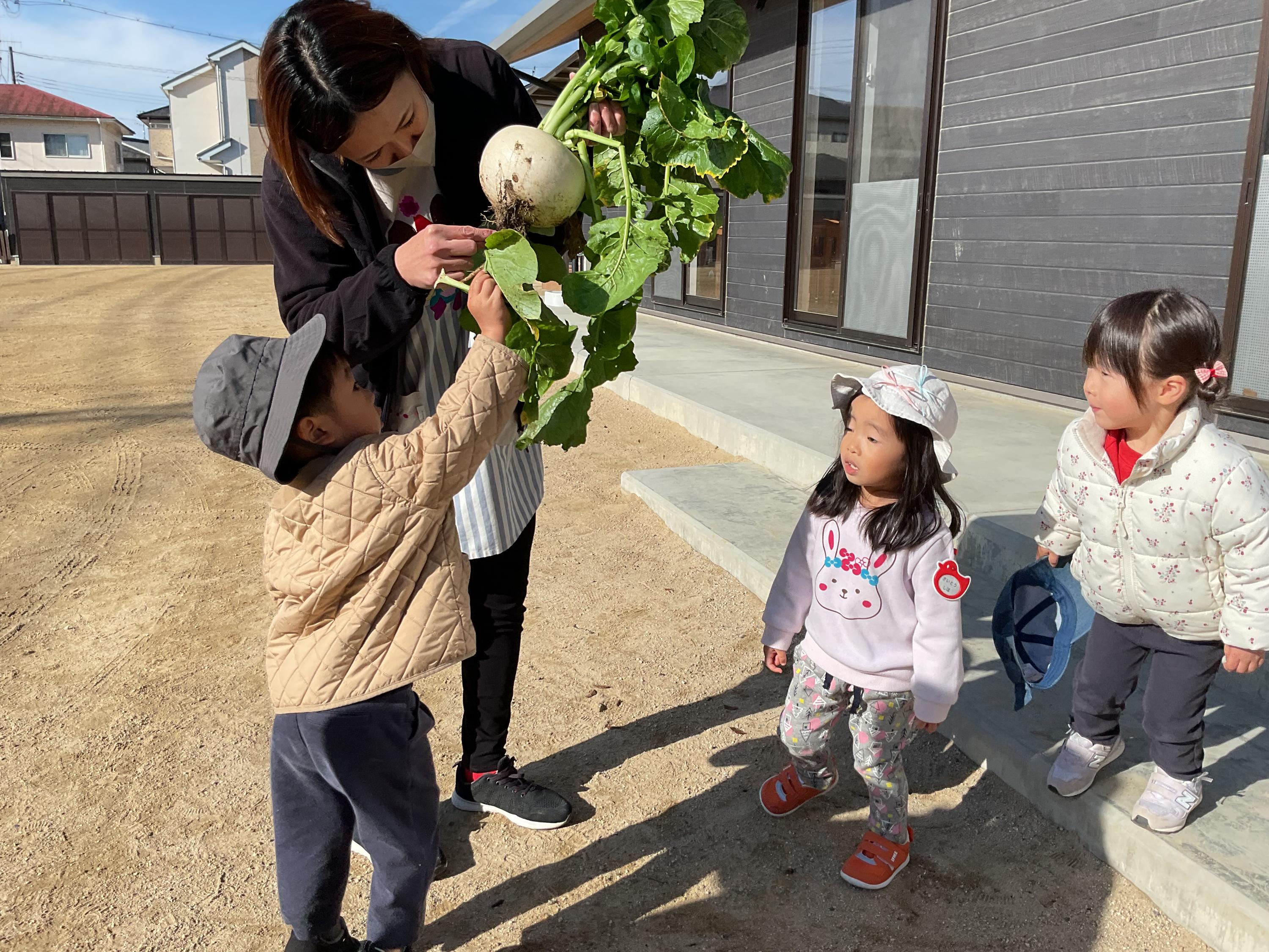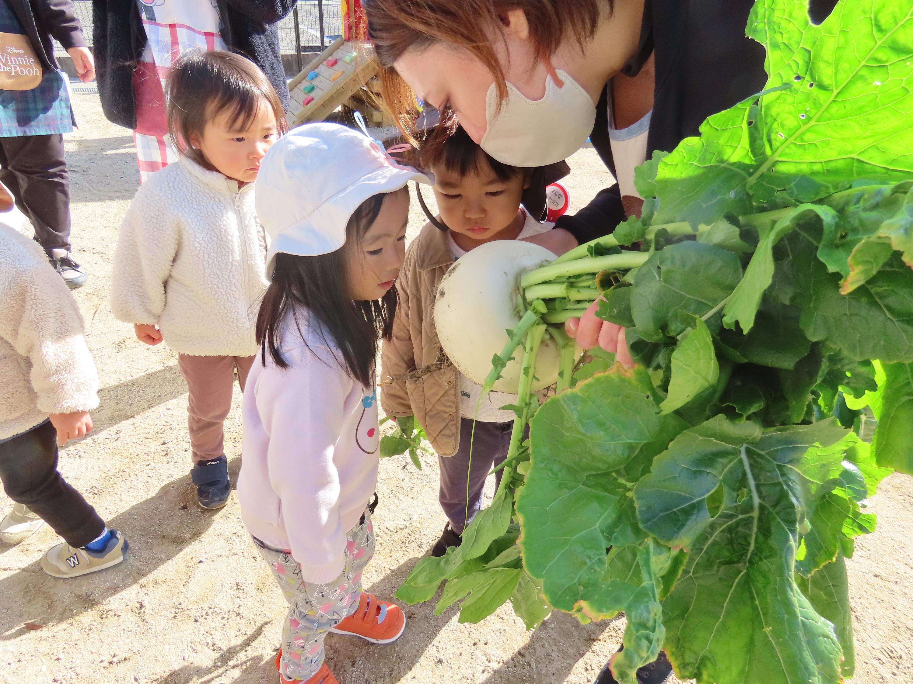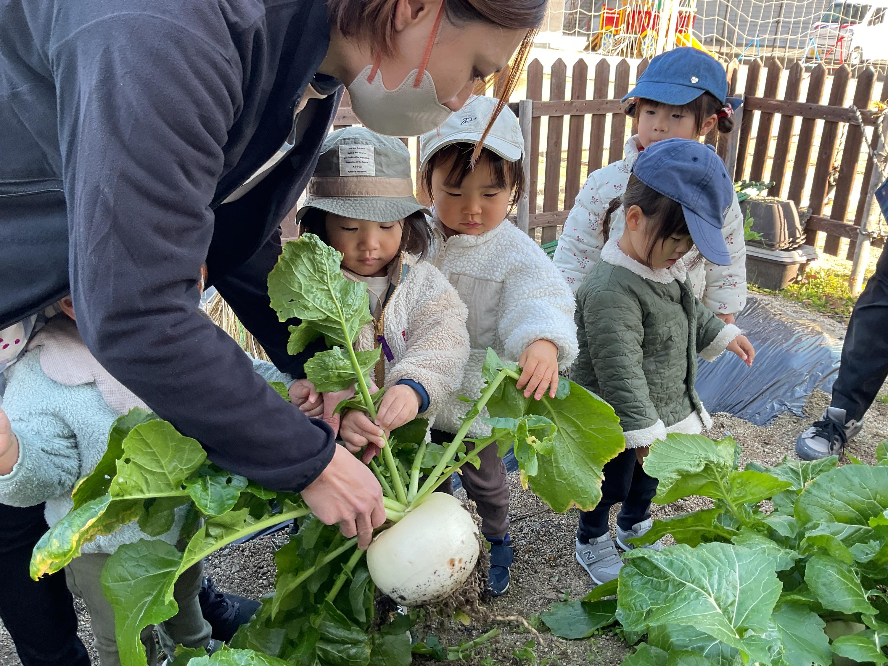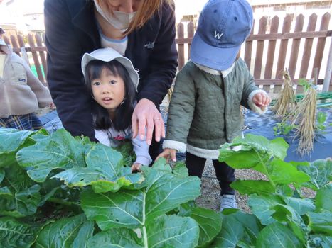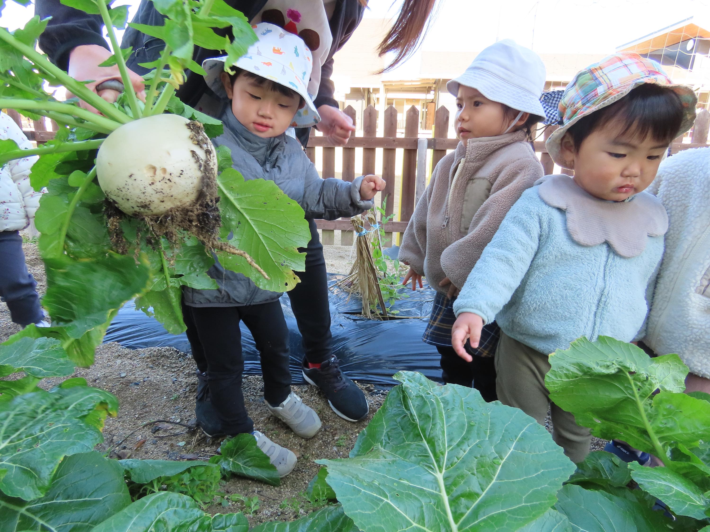 【大きなカブ~ぽっぽ組㈫㈮コース】 畑に大きなカブができました。 ぽっぽ組(火)(金)コースのお友だちが畑にカブを採りに行きましたよ。 大きな葉っぱがたくさん。その下に真っ白なカブが出来ています。「たくさん、あるねぇ。」 「うんとこしょ、どっこいしょ」おおきなカブがぬけましたよ。 「これが、『根っこ』ですよ。おひげみたいねぇ。」 根っこに『ミミズ』が、からまっていてびっくり! 「お迎えの時にお家の人にも見てもらおうね。」カブを靴箱の上に置きました。