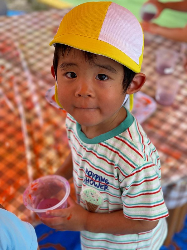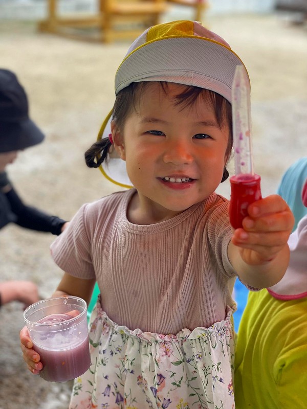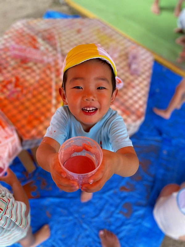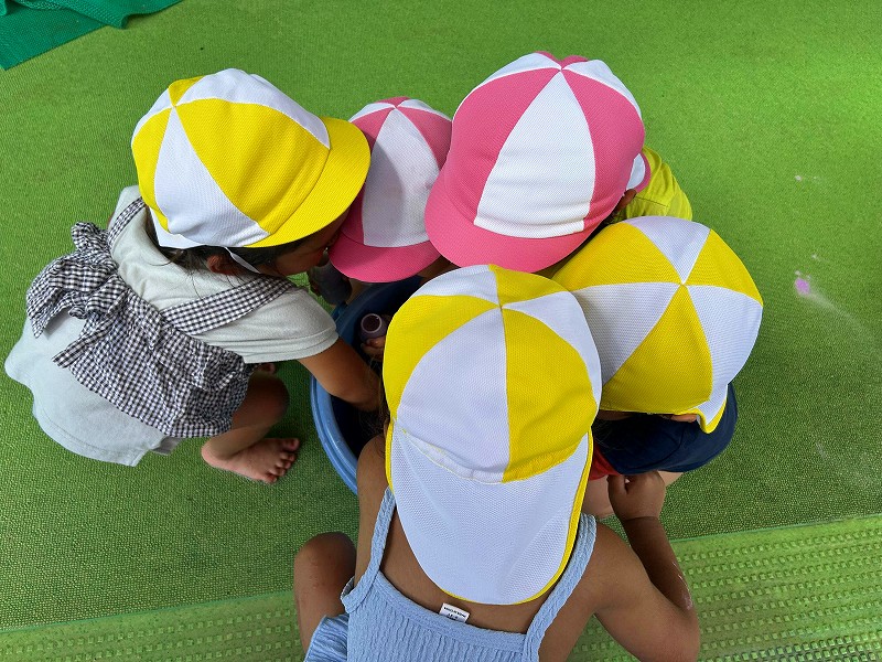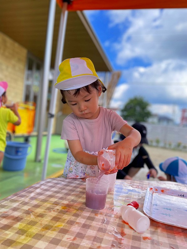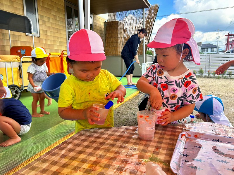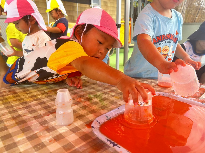 夏の終わり。園庭で、みんなで色水あそびをしました。