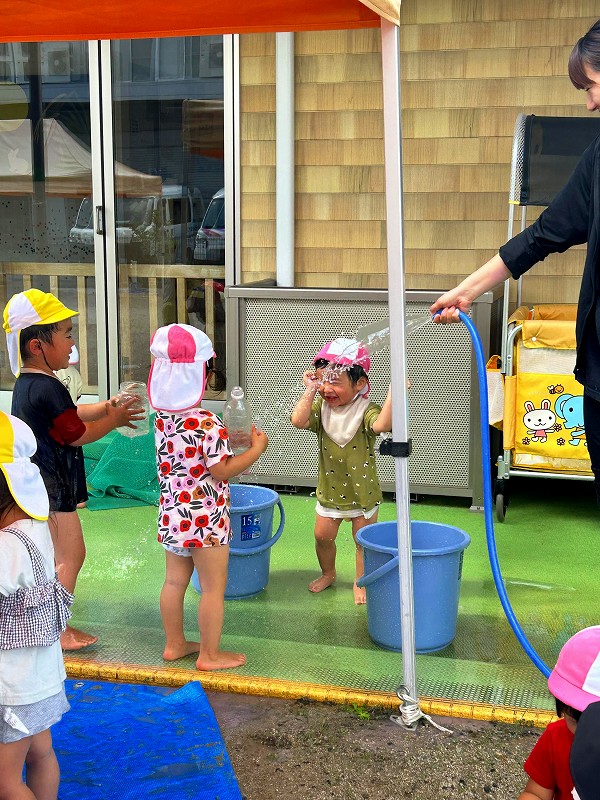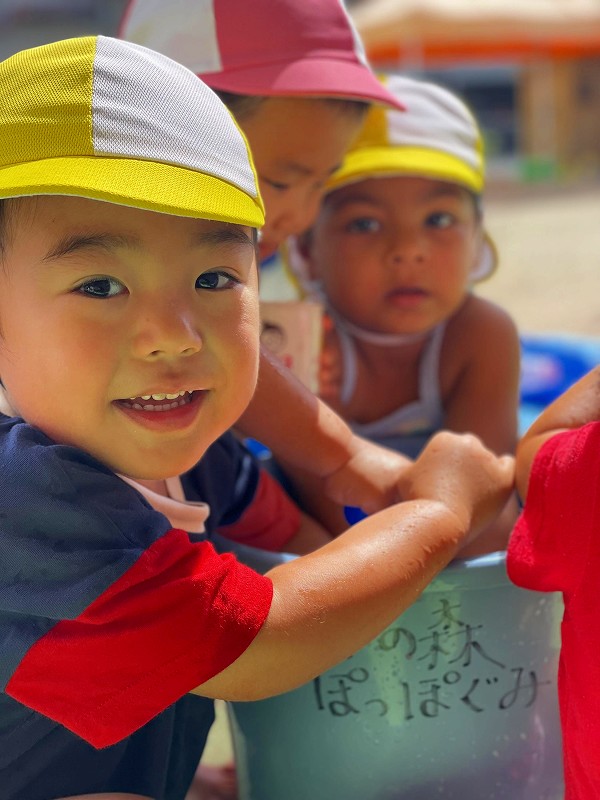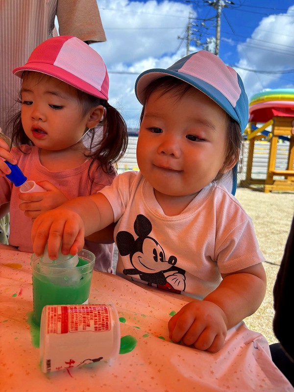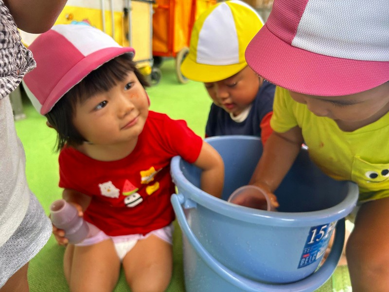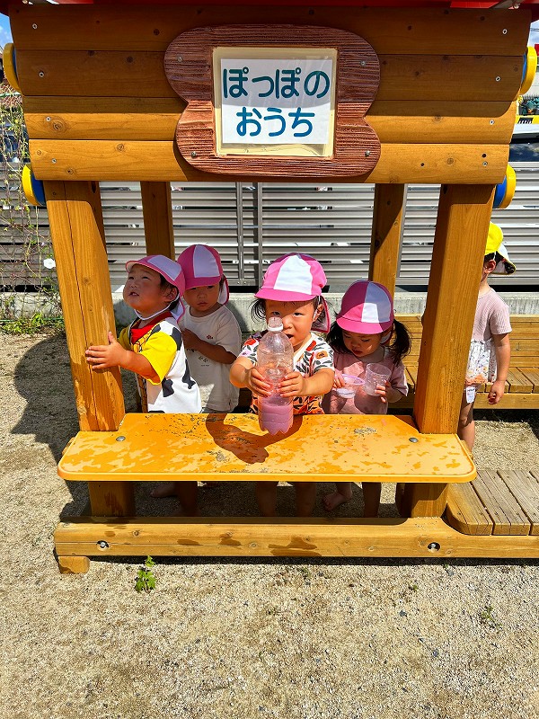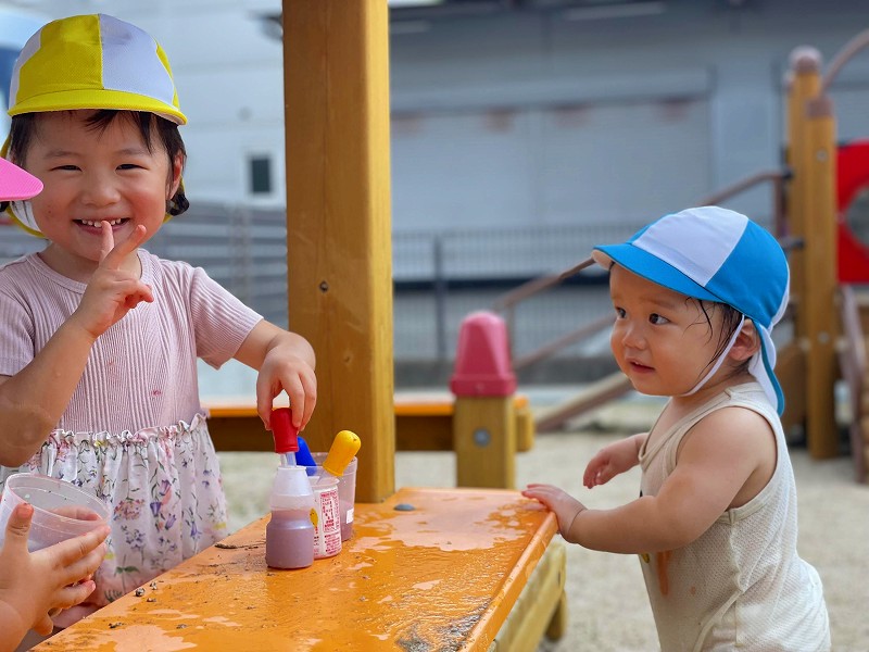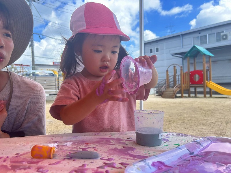 夏の終わり。園庭で、みんなで色水あそびをしました。