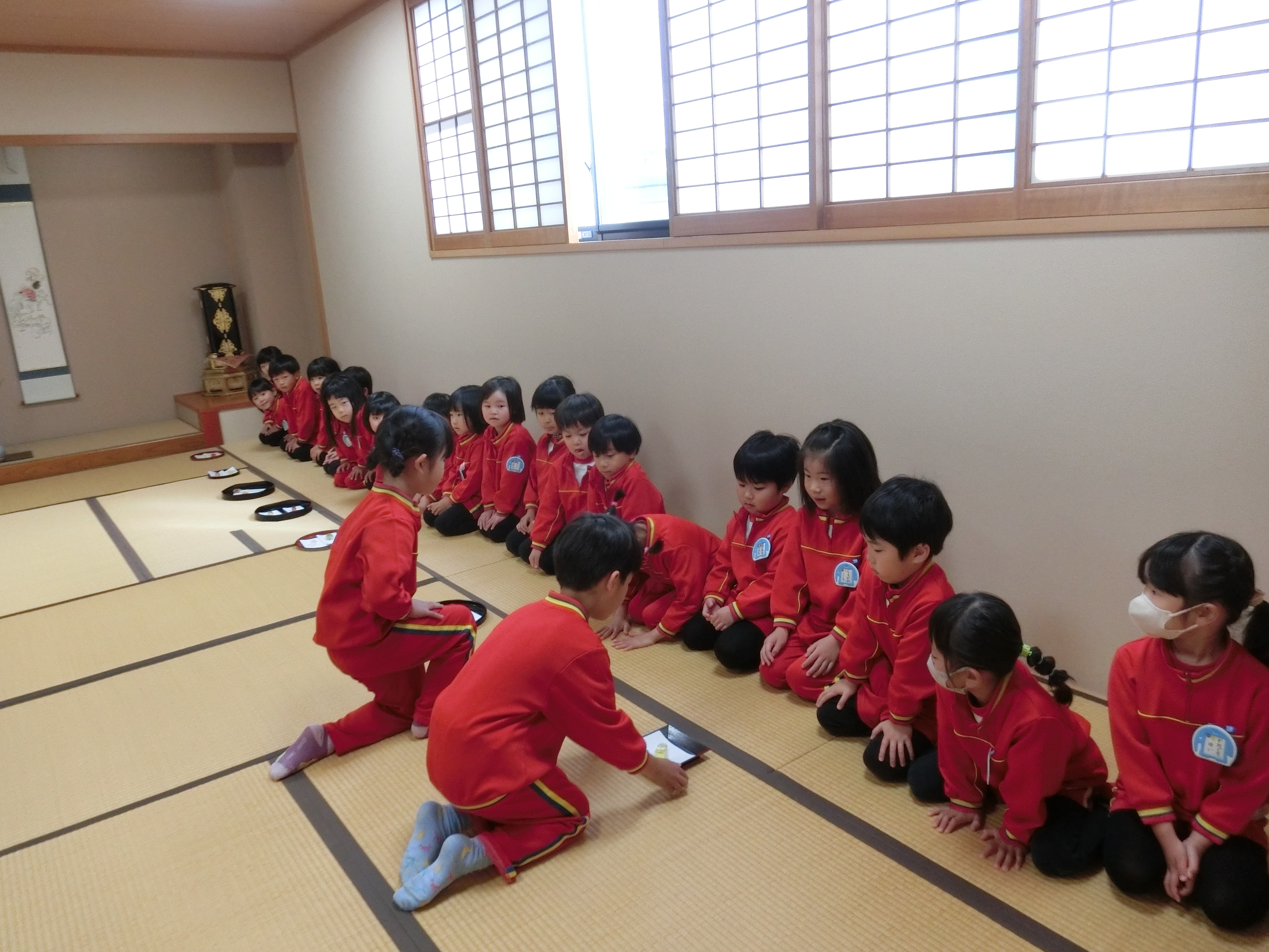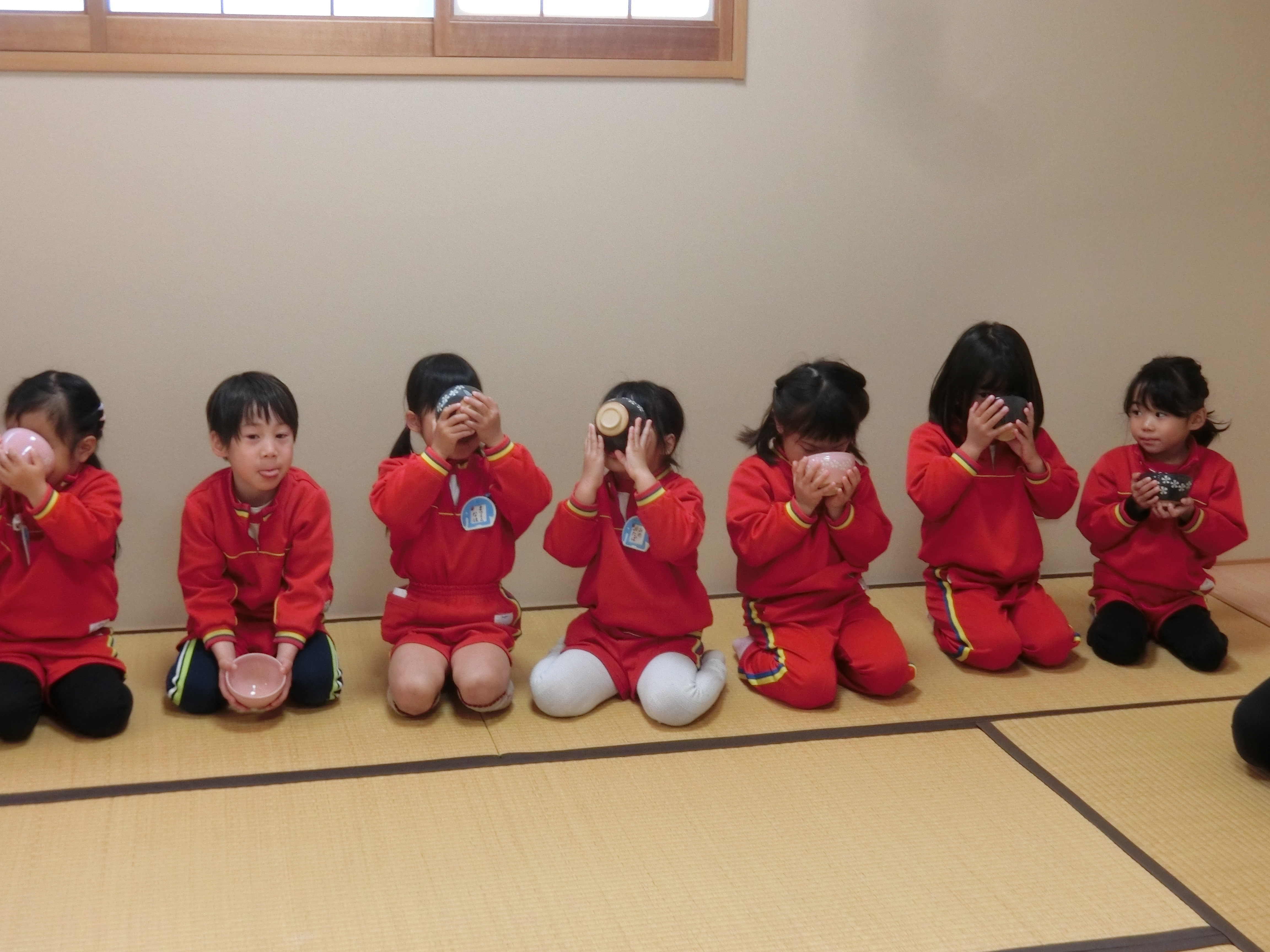 4月から年長組になるゆり組さんを、年長さんがお茶席に招待しました。お菓子を食べて、お茶をいただいたゆり組さんは、とても嬉しそう! 年長さんみたいになりたいね。