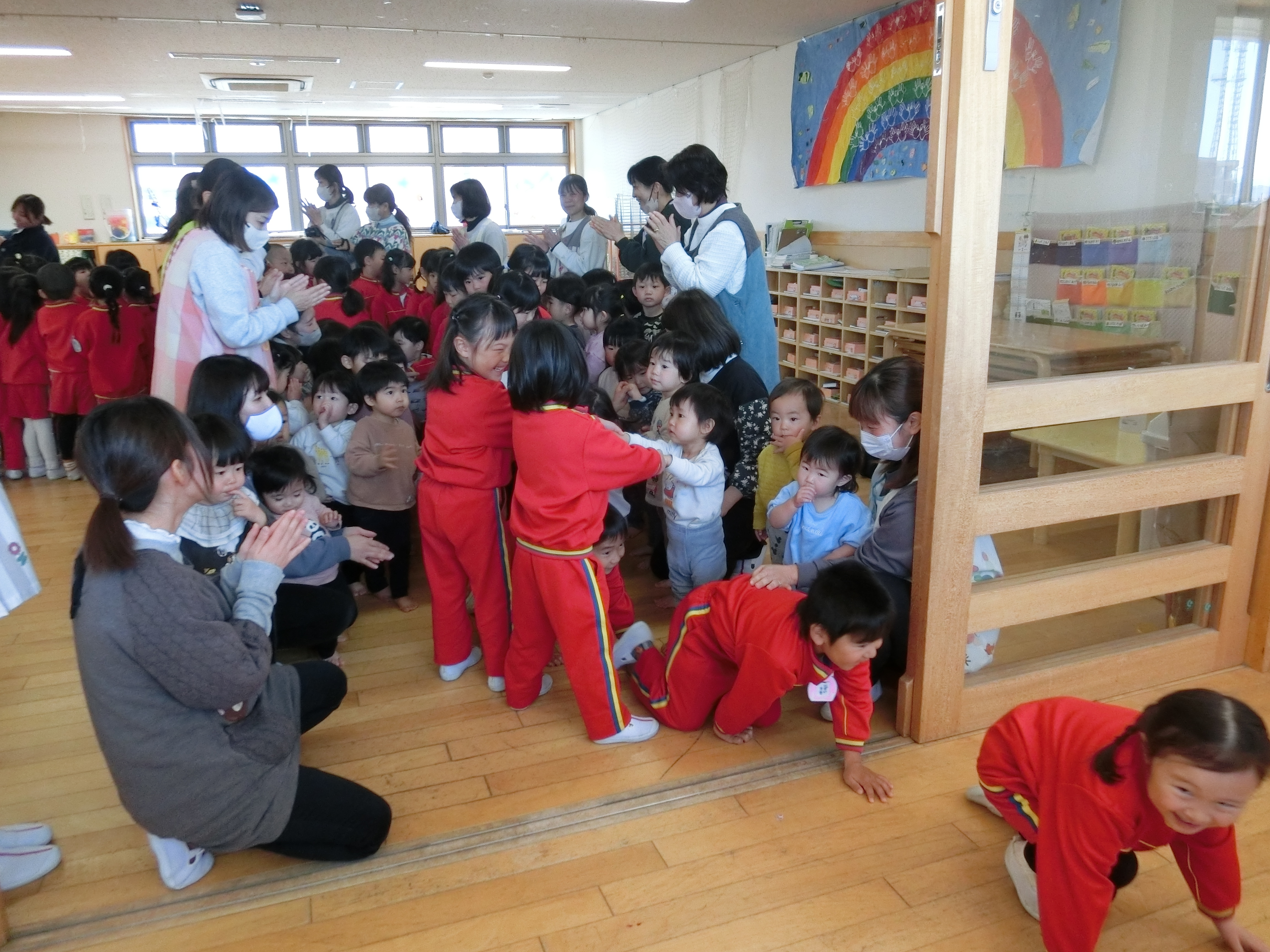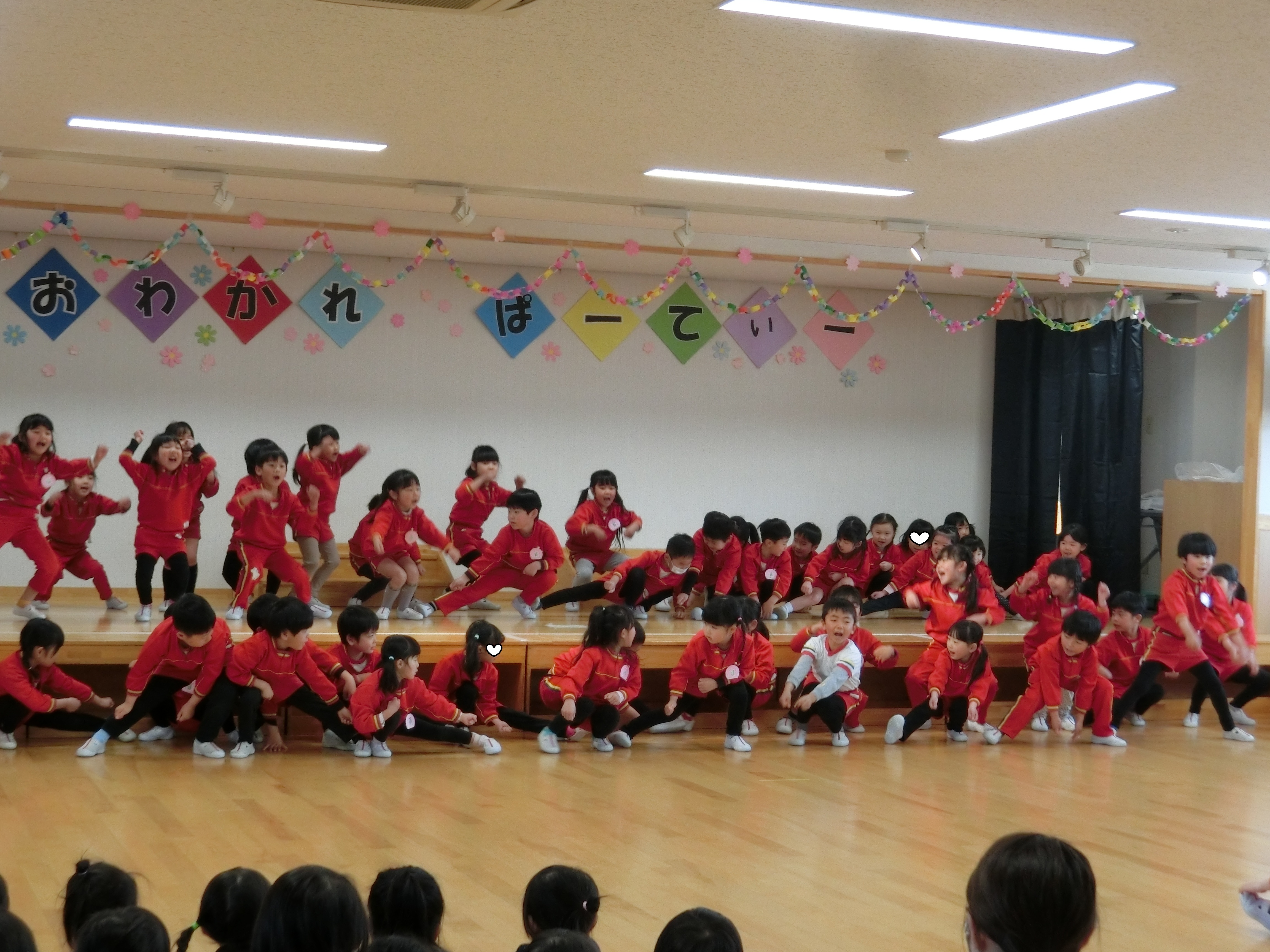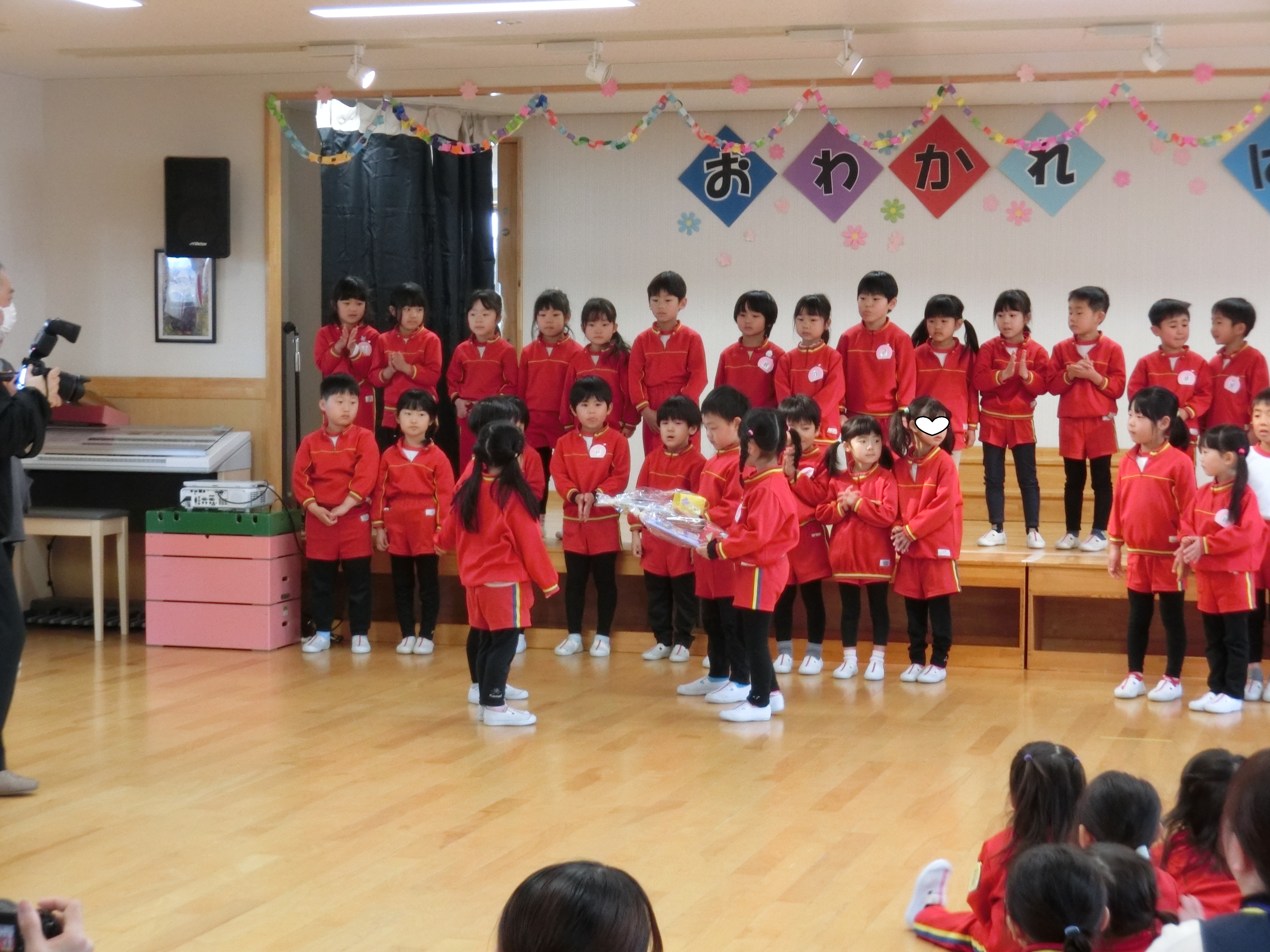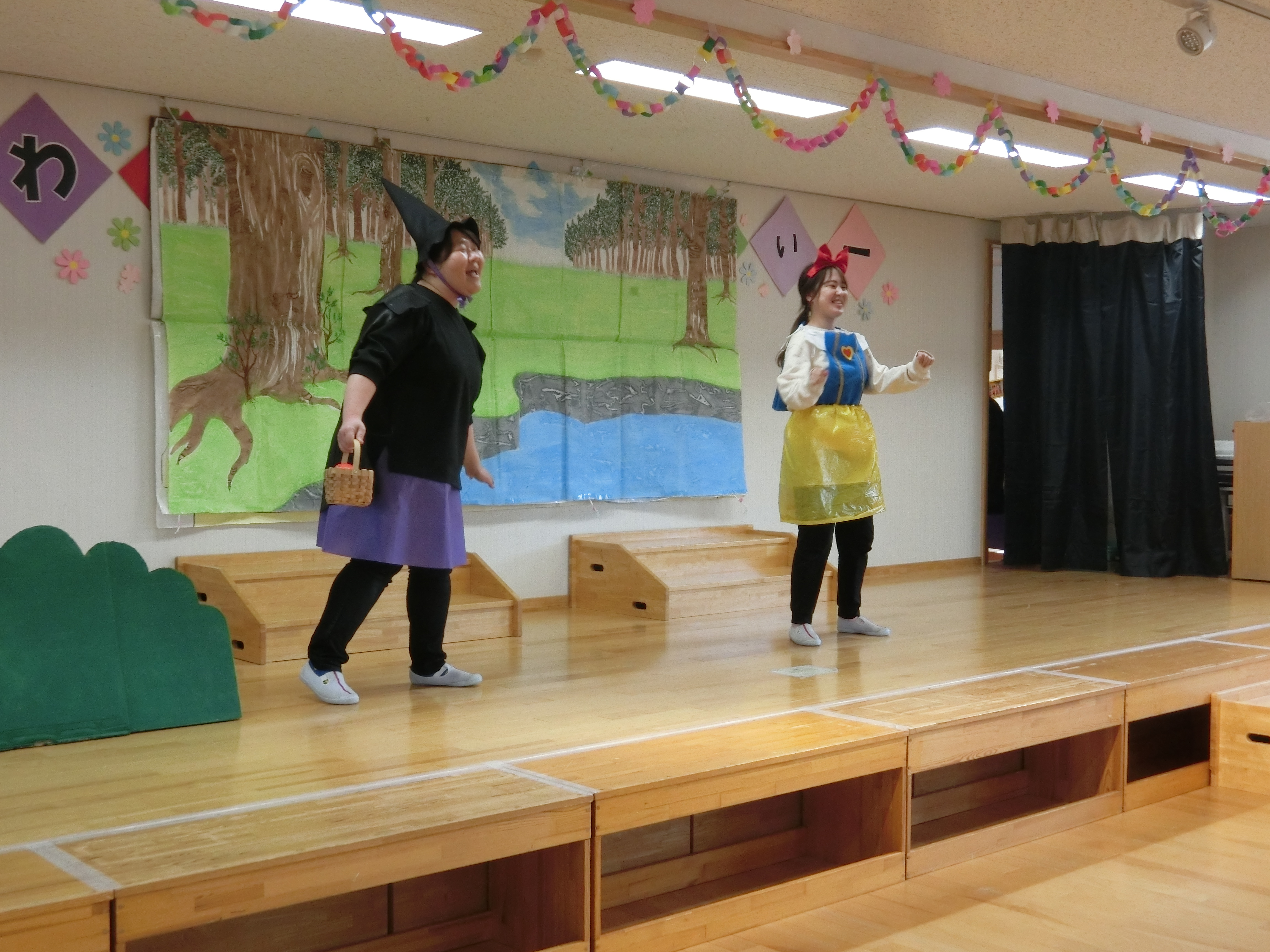 お別れパーティーをしたよ! 3月11日は、もうすぐ卒園する年長組さんとの思い出作りの日、『お別れパーティー』をしました。まずは先生たちの「白雪姫」の劇を見ました。そして年長さんは「ソーラン節」を見せてくれて、その後に小さなお友だちがみんなで作ったプレゼントを渡しました。 年長さん、たくさん遊んでくれて、優しくしてくれてありがとうございました。こばとの森のことを、いつまでも忘れないでいてね。