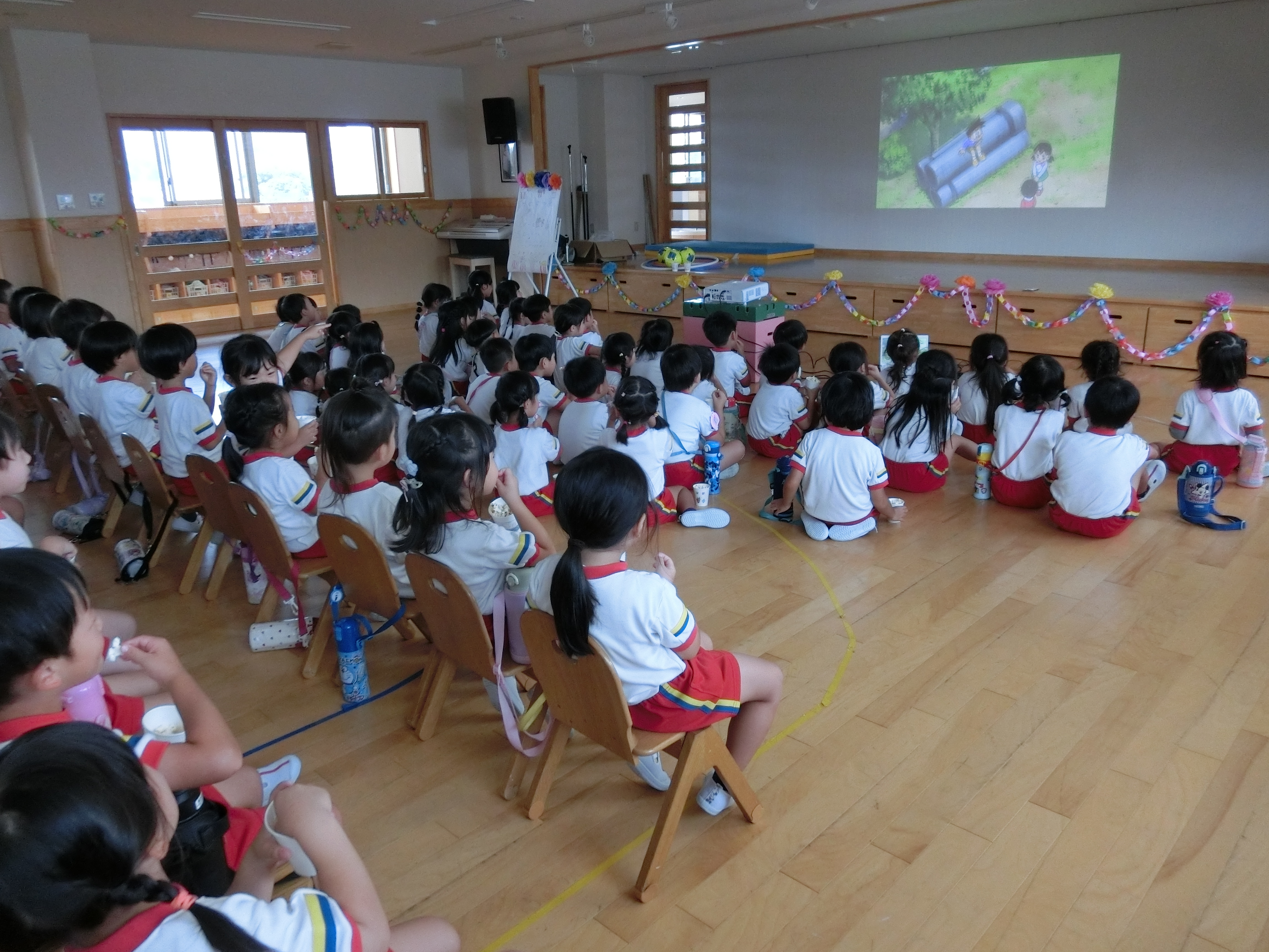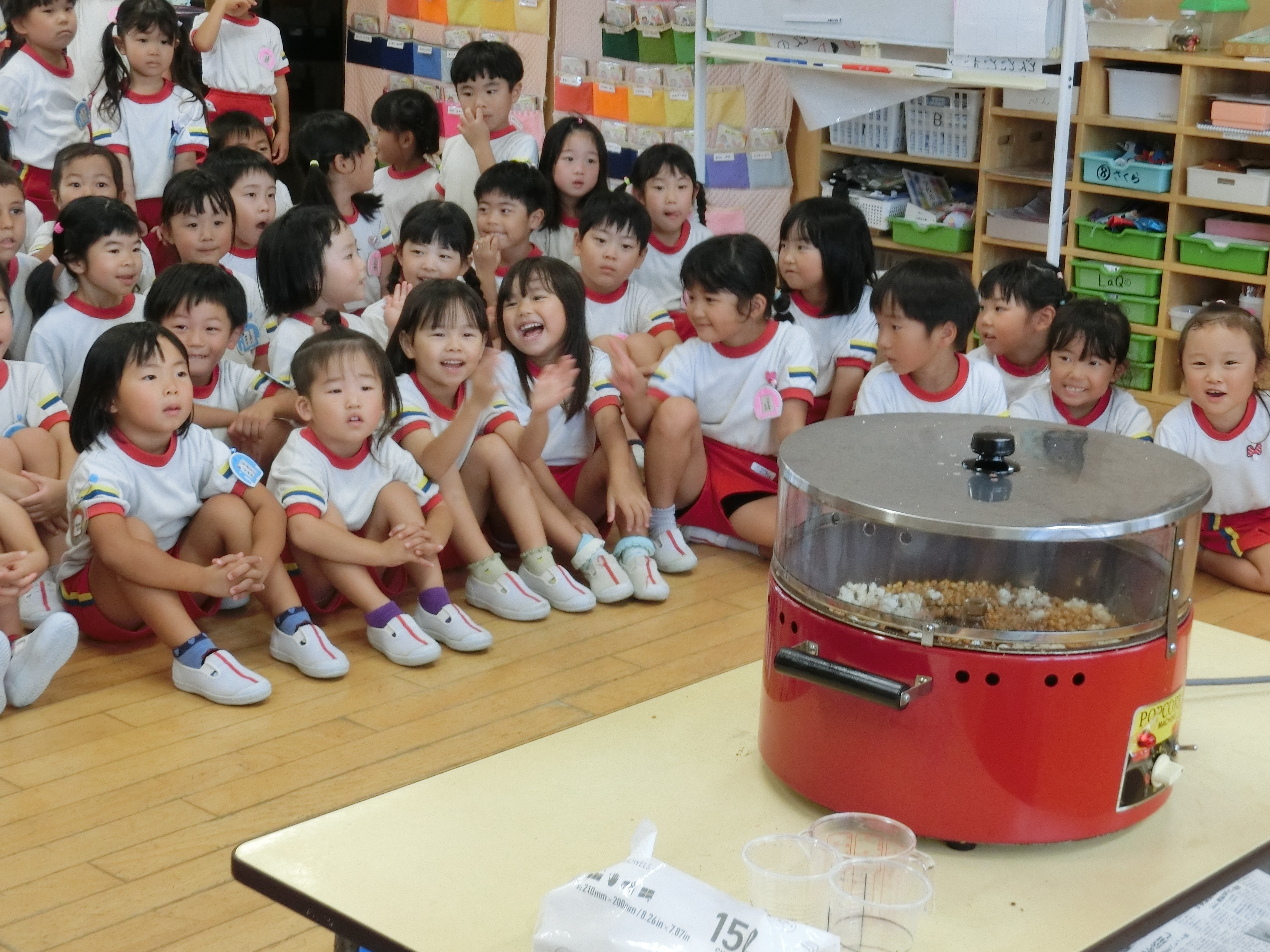 ポップコーンパーティー 年長さくら組が育てたトウモロコシを使って、ポップコーンパーティーをすることにしました。年中ゆり組も招待してあげました。まずは、ポップコーン作りです。 そして、ゲーム大会をした後は、ポップコーンを食べながら映画を見ました。 楽しくて、おいしかったパーティーでしたね!