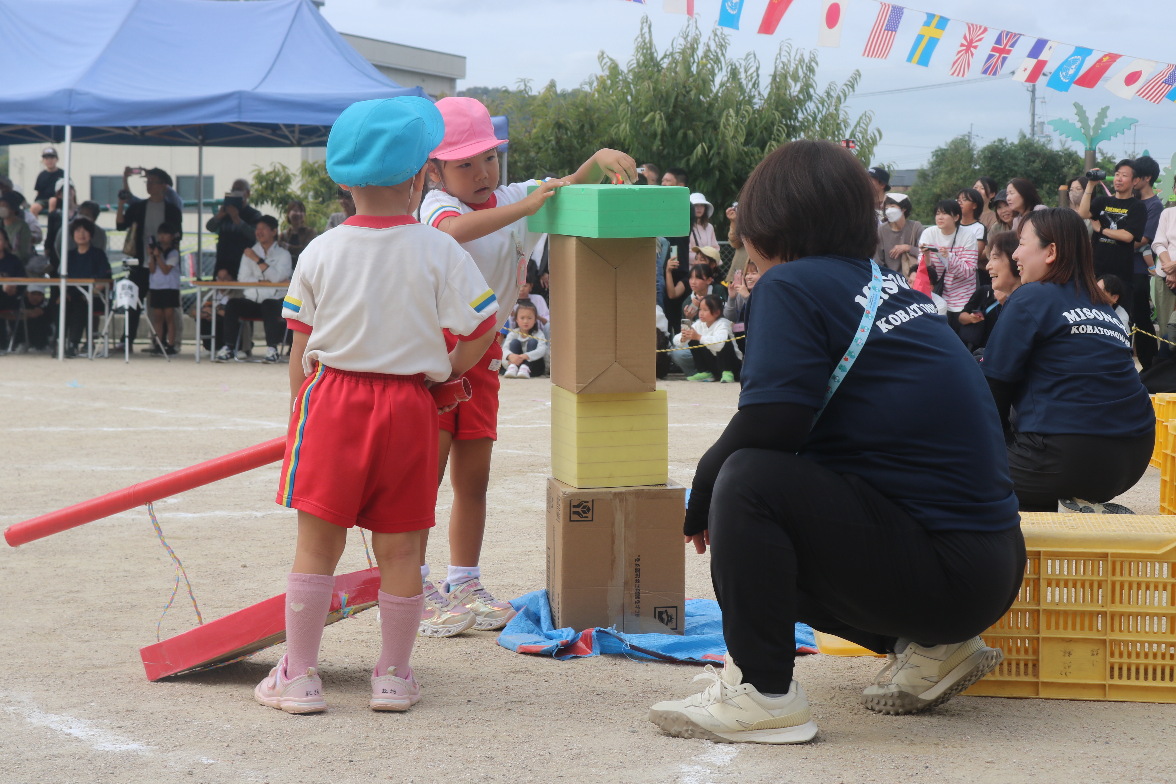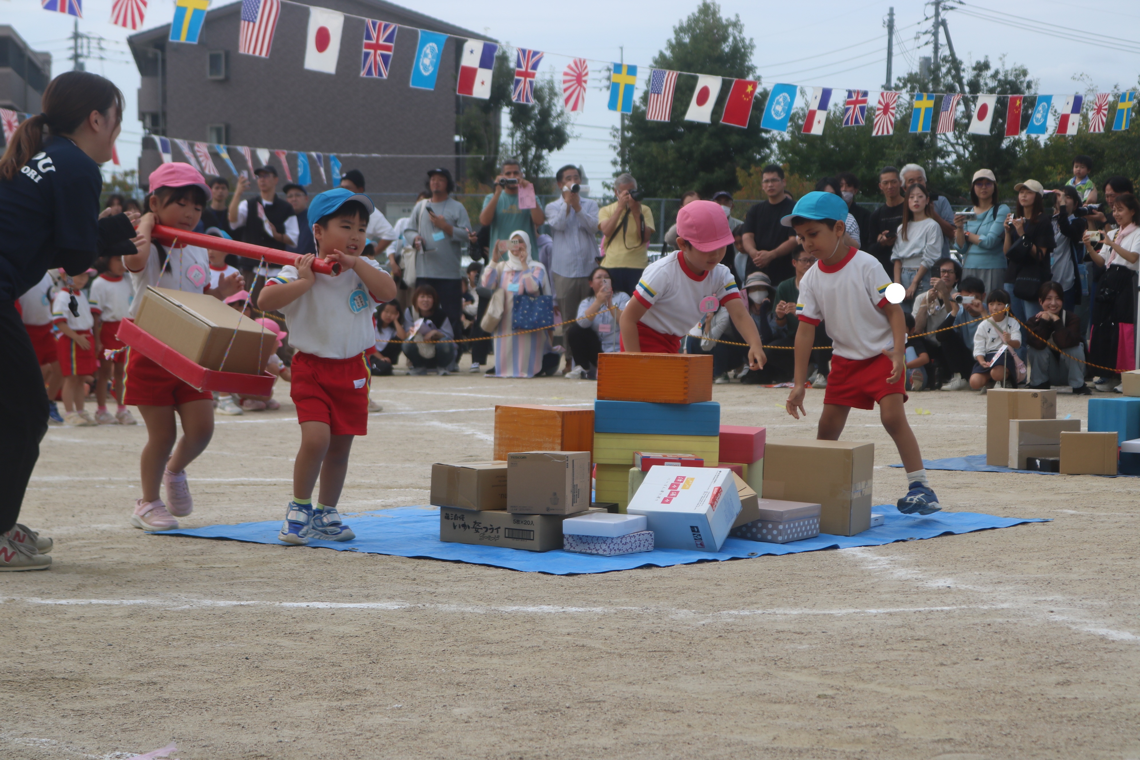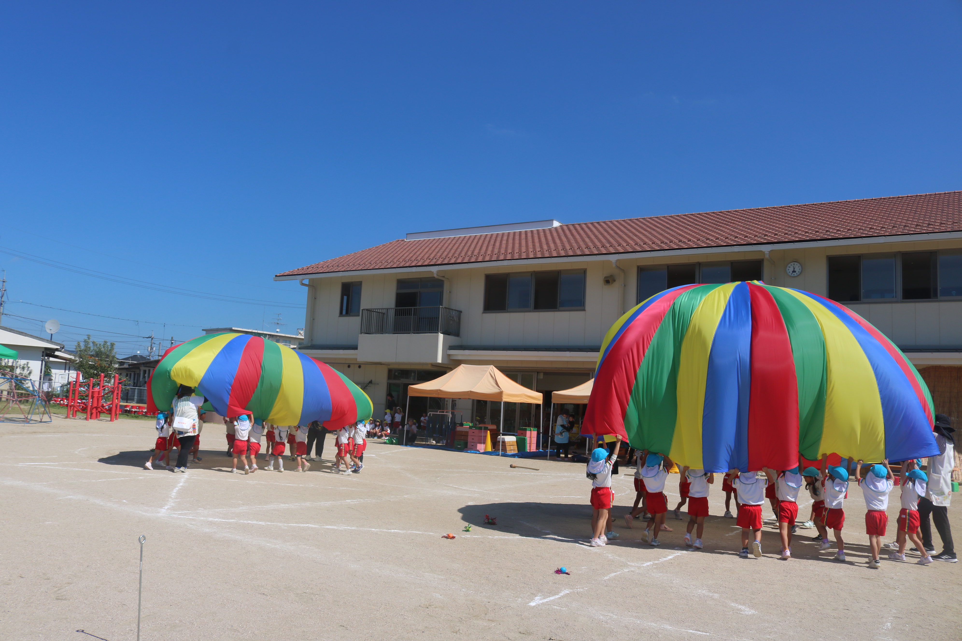 R7 運動会 楽しかったね! 10月18日(土)は、こばとの森の運動会でした。 天候が心配されましたが、青空の元、たくさんの方の応援の中で、子どもたちは元気いっぱい運動会を楽しむ事ができました。 年長 鼓笛隊・台風の目・グループ対抗リレー 年少 ダンス 親子ででかパンリレー 年中 パラバルーン 年中と年長合同で 運んで積んで競争 その他にも、いろいろな競技を行いました!